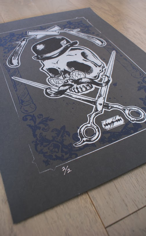 This is my first stab at screen printing. I printed 2 small editions. The first is a 2 color print on black Stonehenge paper. I used a silver ink along with a dark blue that has some of the silver mixed in to give the blue a slight metallic look. The prints tuned out great so I printed another small edition of 2 with a third color. I printed a black ink for the third color to bring out the line work in the illustration.